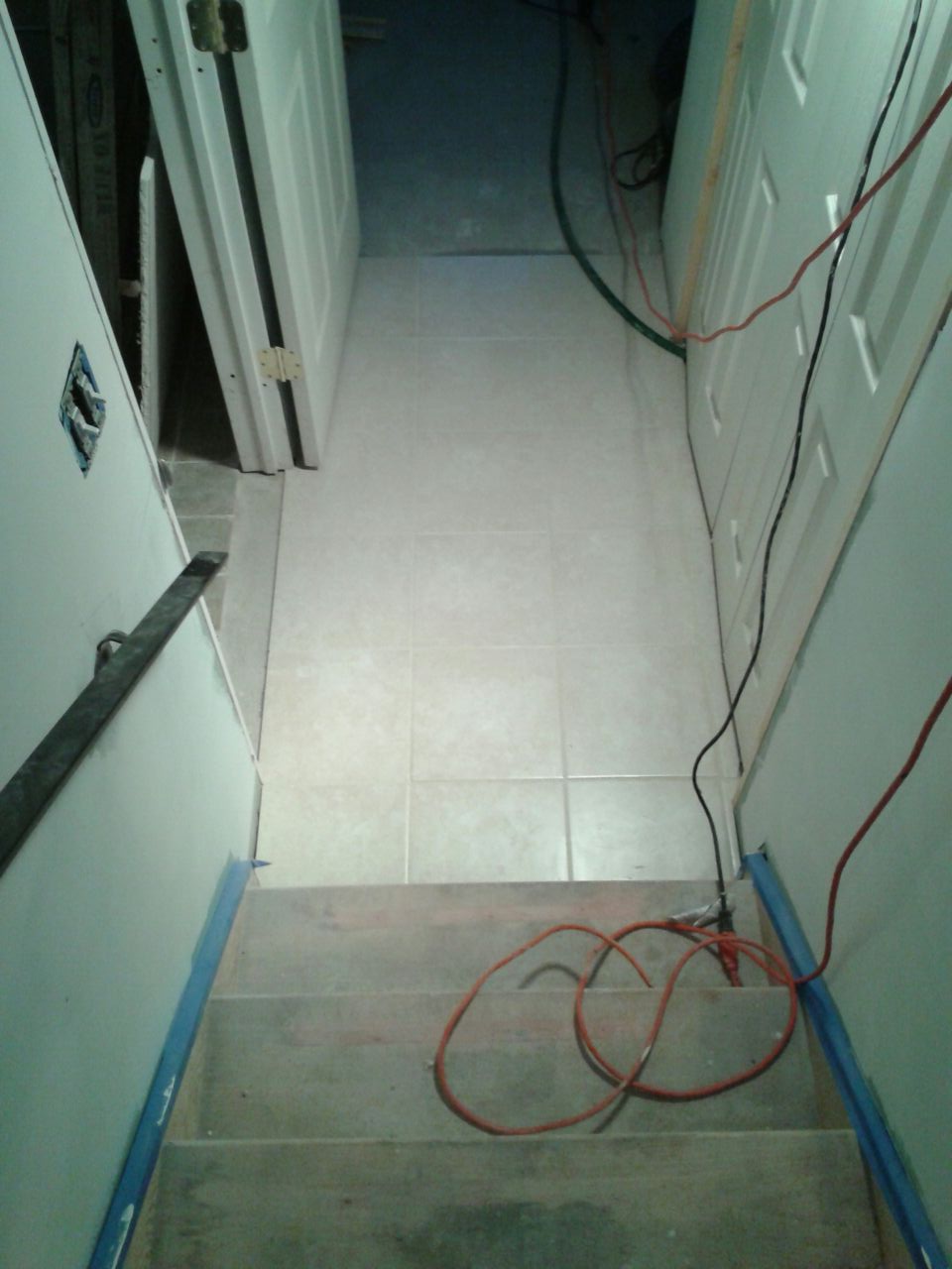 In between moving, I laid some tile in the basement level and the laundry closet, because the washer and dryer are scheduled to arrive Thursday. I wanted to get the tile down in that section at least. It was tricky to lay out, because I had to work backwards in order to be able to leave the room. There are a couple of too-wide spaces between tiles. Luckily I chose a grout the same color as the tile, so it's pretty forgiving.